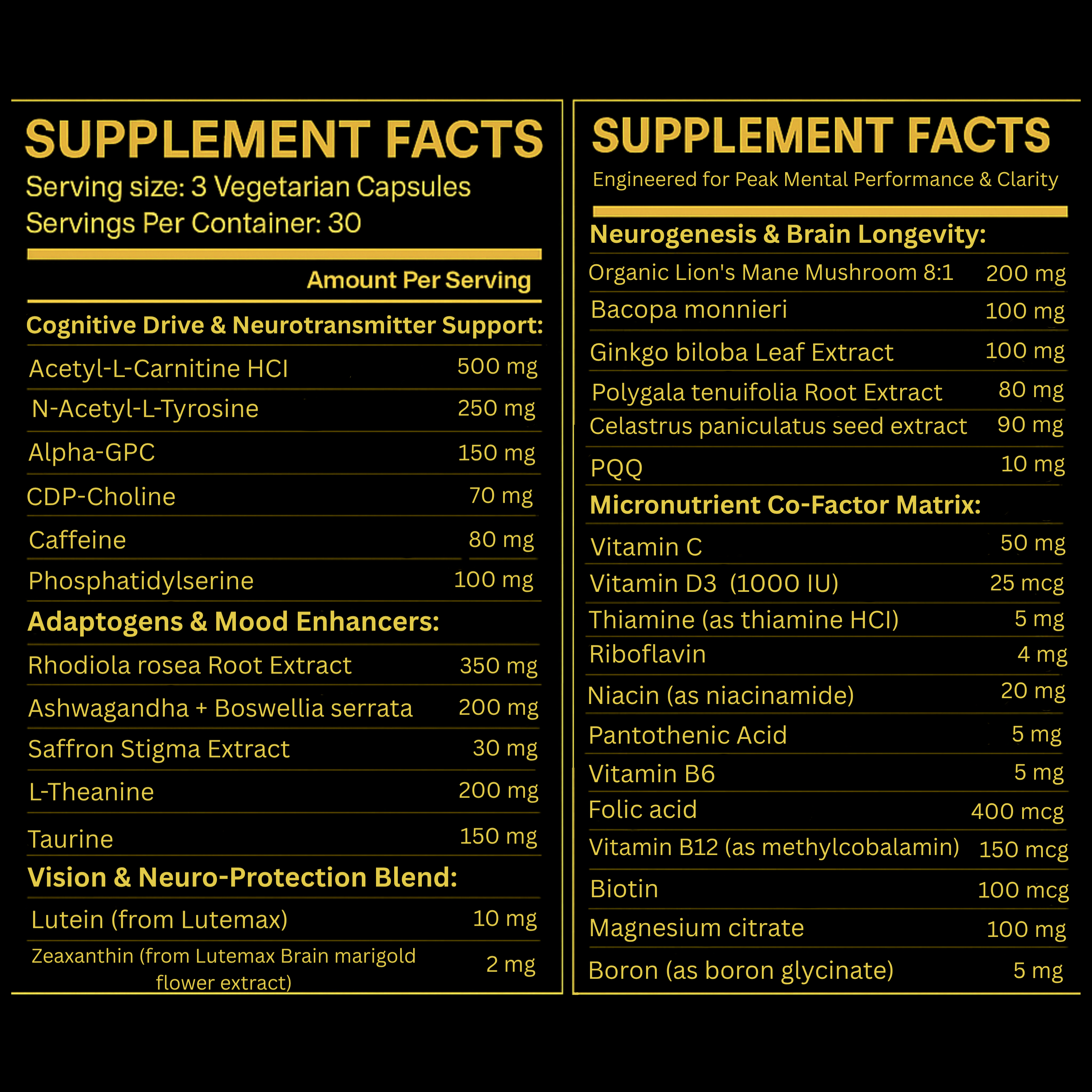 We source our ingredients with uncompromising standards. Take our Lion’s Mane, for example — extracted from LionsMane, a high-potency concentrate known to support BDNF (brain-derived neurotrophic factor), encourage nerve regeneration, enhance neuroprotection, and fuel overall brain health